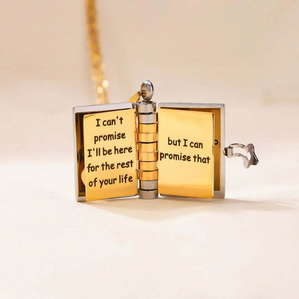 Express your love in a timeless way with our I'm Always With You Book Necklace - an engraved stainless steel pendant designed to carry your deepest emotions.